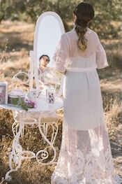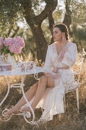 Cada prenda cobró vida en este entorno idílico, resaltando su delicadeza y exquisitez en una escena digna de un cuento. La lencería y batas de novia de Ángeles Serrano no solo celebraban la feminidad, sino que narraban una historia de elegancia atemporal, convirtiendo esta sesión en un homenaje visual al romanticismo clásico con un giro moderno.