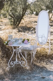 Así nació «Un té al atardecer», una producción donde cada detalle fue pensado para construir una atmósfera de ensueño. En mitad del campo, creamos un set inspirado en la estética Shabby Chic, con una delicada mesa de té adornada con vajilla vintage, hortensias frescas y un espejo de madera que reflejaba la luz cálida del atardecer. Un escenario que evocaba la sofisticación y el encanto de otra época, pero con un aire fresco y natural.